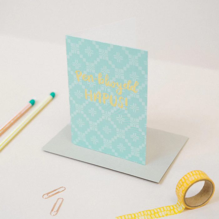 A bright and colourful Welsh birthday card featuring hand-written text and original illustrations, and is finished in gold foil.