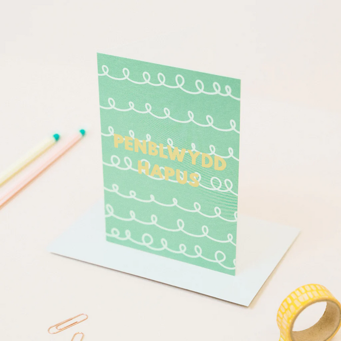 A bright and colourful Welsh birthday card featuring hand-written text and original illustrations, and is finished in gold foil.