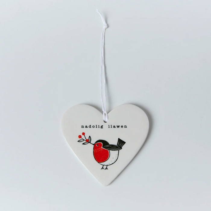 This beautiful ceramic heart-shaped Christmas decoration features a festive robin design, as well as the Welsh words for Merry Christmas - "Nadolig Llawen".