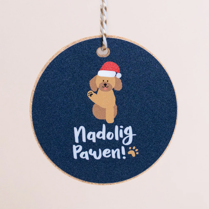 A cute gift decoration featuring an original illustration of a dog. 'Nadolig Llawen' is Welsh for 'Merry Christmas' and 'Pawen' is Welsh for 'paw'. A great addition to decorate a tree or to add to your Christmas gift wrapping.