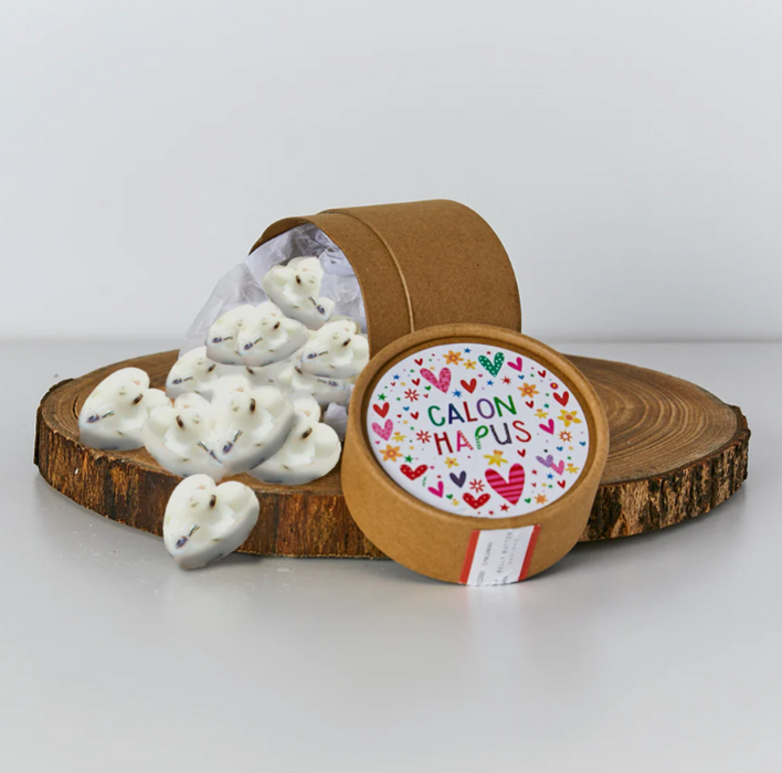 15 flower-shaped scented soy wax melts, delicately fragranced with Plum & Bramble, with a colourful hearts design with the Welsh words "Calon Hapus", a Happy Heart.
