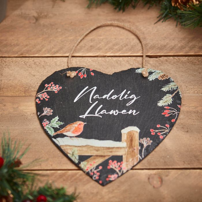 Christmas Heart Slate Plaque - Robins - 'Nadolig Llawen'