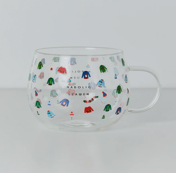 This beautiful glass mug featuring a pretty festive design of Christmas jumpers, as well as the Welsh for Merry Christmas - "Nadolig Llawen".
