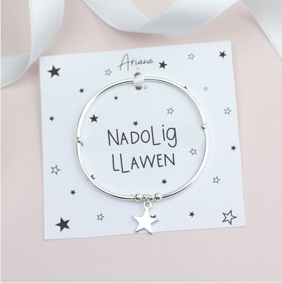 This Welsh 'Nadolig Llawen' carded silver plated noodle bracelet has a silver star bead (please note image shows a silver heart charm).