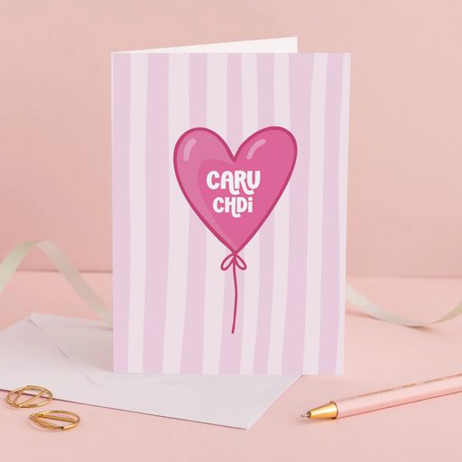 Description Make someone smile with this fun card. A colourful card featuring a heart shaped balloon. 'Caru Chdi' is Welsh for 'I Love You' (in no...