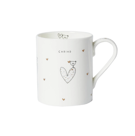 Description This large fine bone china mug featuring a stylish bird monochrome design with metallic accents, as well as the Welsh word - "Cariad" w...