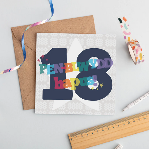 No reviewsDescription This colourful card is perfect to celebrate a special eighteenth birthday for an eighteen year old! 'Pen-blwydd hapus' is Welsh for 'Ha...