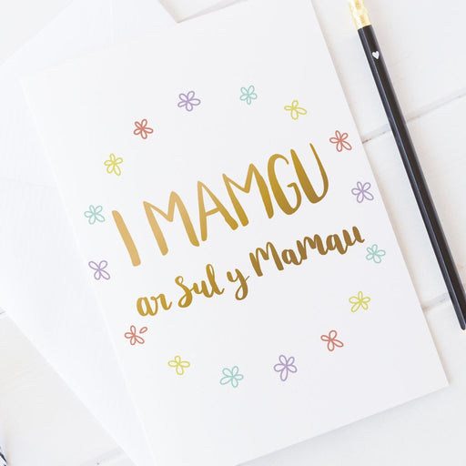 Description A luxury card featuring hand-written text, illustrated flowers and gold foil. 'I Mam ar Sul y Mamau' is Welsh for 'To Mum on Mother's ...