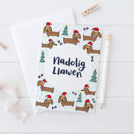 Description A fun and modern card for Christmas! This card features hand-written text with dachshunds and Christmas trees.'Nadolig Llawen' is Welsh...