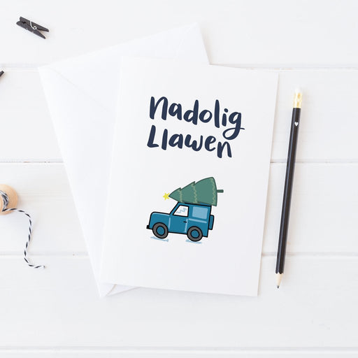 Description A bright and modern card for Christmas. This card features hand-written text and a 4x4 vehicle carrying a festive tree. 'Nadolig Llawen...