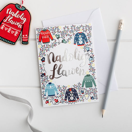 No reviewsDescription A luxury card featuring hand-written text, illustrated jumpers and lights, finished with beautiful silver foil. 'Nadolig Llawen' is We...
