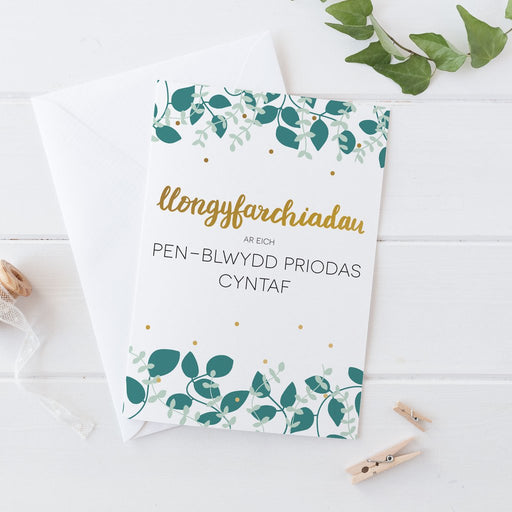 Description This card features hand written text and stunning gold foil. 'Llongyfarchiadau ar benblwydd eich priodas' is Welsh for 'Congratulations...