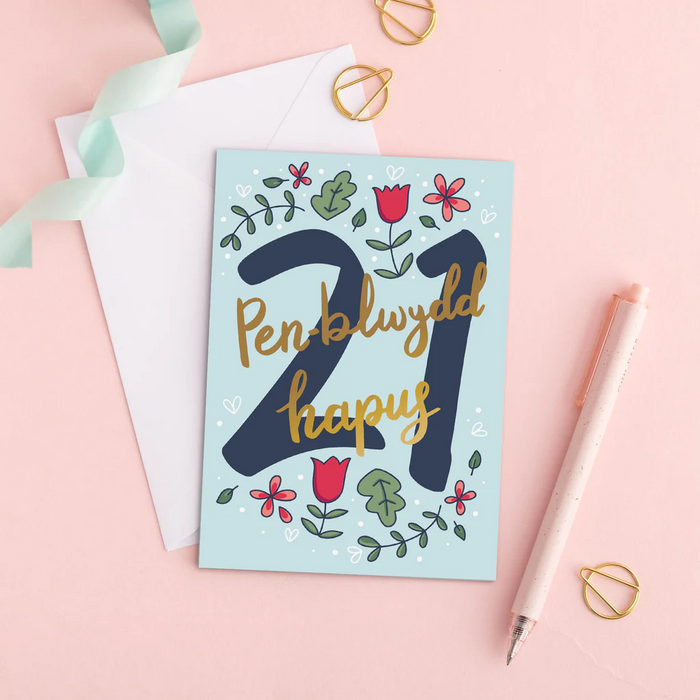 Birthday card 'Penblwydd hapus 21' floral gold foil