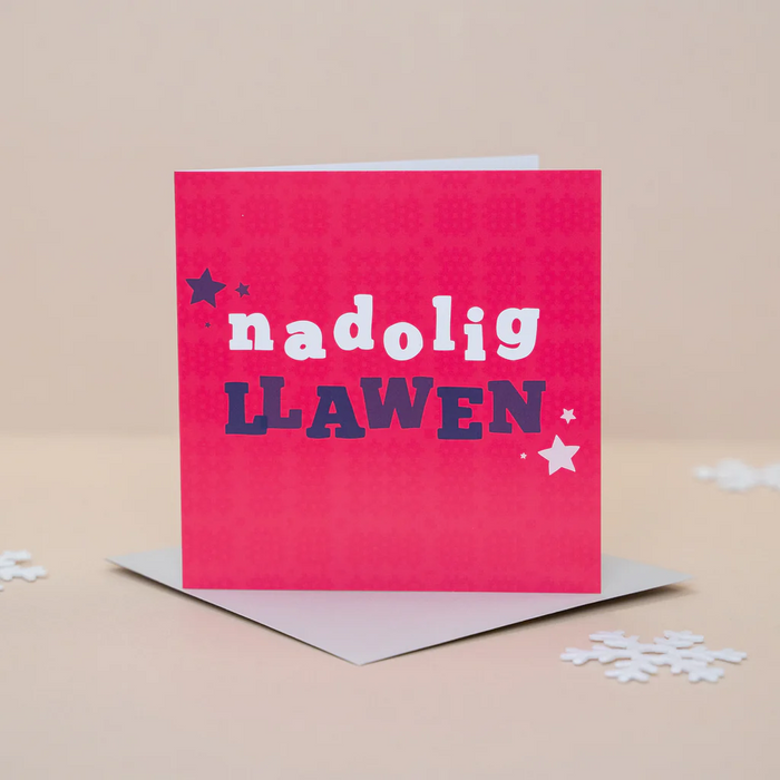 A colourful card to give at Christmas. 'Nadolig Llawen' is Welsh for 'Merry Christmas'.
