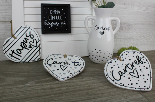1 reviewDescription These heart shaped plaques are ceramic with a cork backing feature a hanging rope with striking monochrome designs. Choose from: Car...