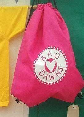 A pink drawstring bag with 'Bag Dawns' printed in white.