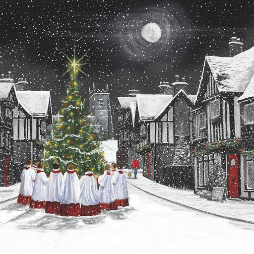 2 reviewsDescription Image on the front of the cards shows a snowy , moonlit, village scene, with a choir singing carols around a Christmas tree. The greeti...