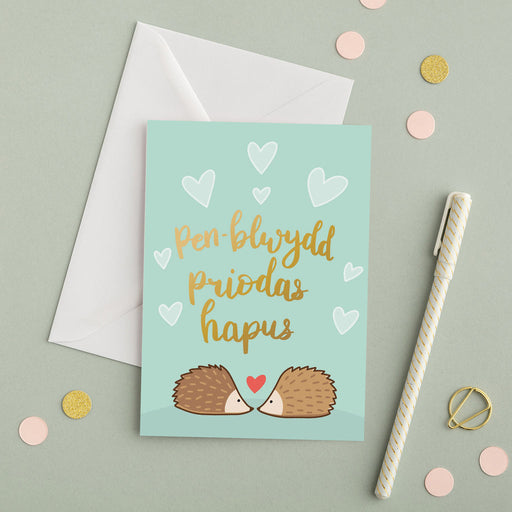 Description A luxury card featuring hand-written text, hand-drawn illustration and gold foil.'Pen-blwydd priodas hapus' is Welsh for 'Happy wedding...