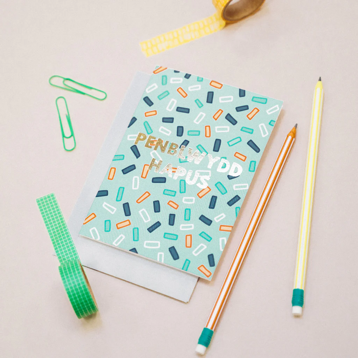 A bright and colourful Welsh birthday card featuring hand-written text and original illustrations, and is finished in gold foil.