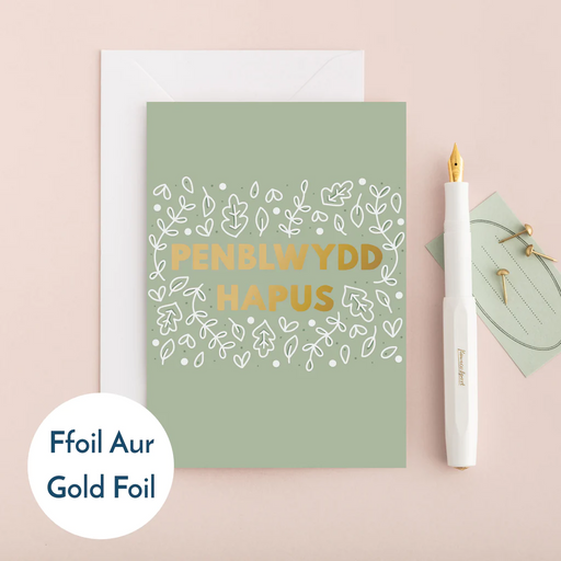 A gorgeous luxury Welsh birthday card featuring bold text and a pretty leaf design, finished with beautiful gold foil.