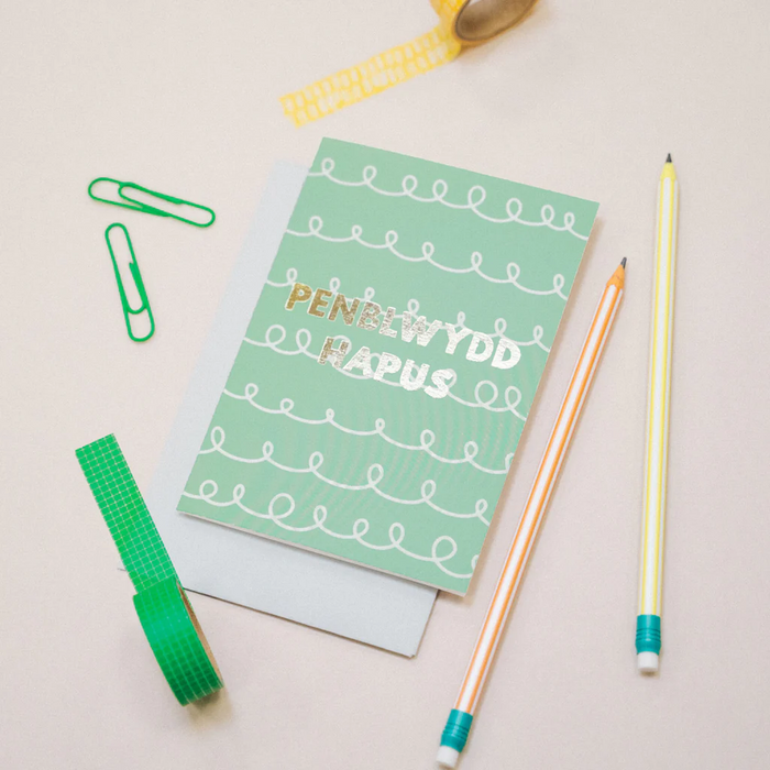A bright and colourful Welsh birthday card featuring hand-written text and original illustrations, and is finished in gold foil.