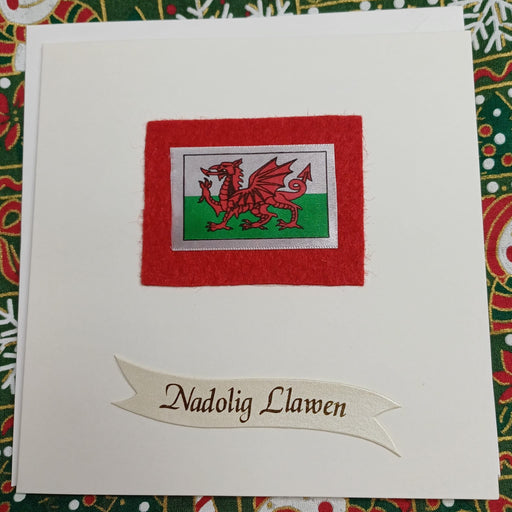 A lovely handmade Christmas card, featuring a patriotic red dragon flag on a red felt background.
