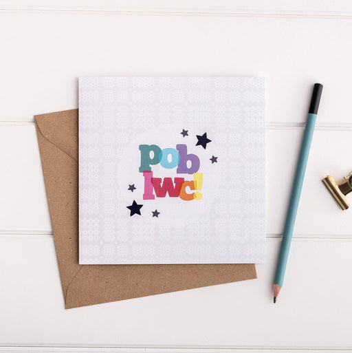 No reviewsDescription A bright card featuring hand-written text and an original illustration. 'Pob lwc' is Welsh for 'Good luck' and is finished in gold foil...