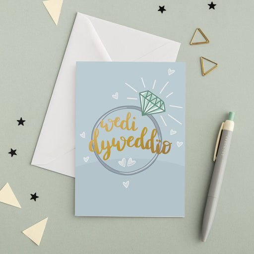 Description A luxury card featuring hand-written text, hand-drawn illustrations and gold foil. 'Wedi dyweddïo' is Welsh for 'Engaged'. Details Bl...