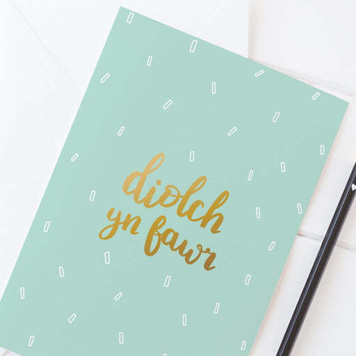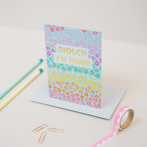 Description Say a big thank you with this bright card. 'Diolch yn fawr' is Welsh for 'Thank you'. Details Finished with gold foil Blank inside fo...