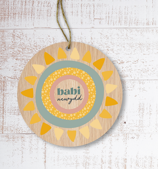 Description A gorgeous wooden gift decoration depicting an illustrated sun to welcome new life. Babi Newydd is 'New Baby' in Welsh. Details Measuri...