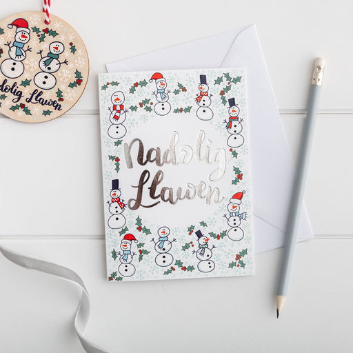 No reviewsDescription A luxury card featuring hand-written text, snowmen and holly, finished with beautiful silver foil. 'Nadolig Llawen' is Welsh for 'Merry...