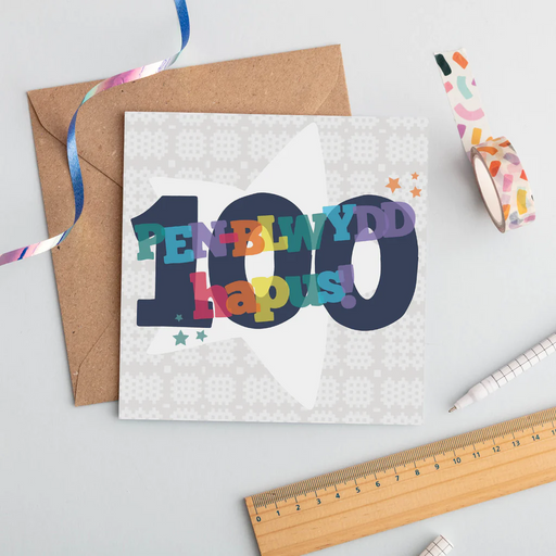 Description This colourful card is perfect to celebrate a special hundredth birthday for a one hundred year old! 'Pen-blwydd hapus' is Welsh for 'H...