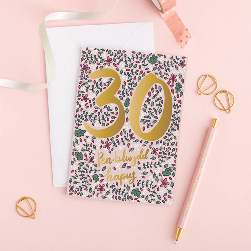 Birthday card 'Penblwydd hapus 30' floral gold foil