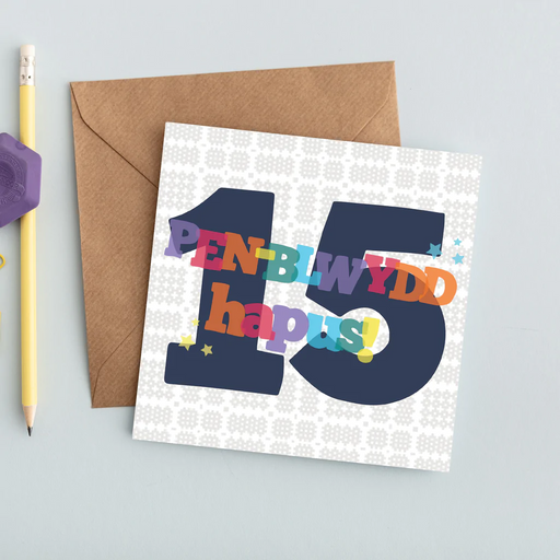Description This colourful card is perfect to celebrate a special fifteenth birthday for a fifteen year old! 'Pen-blwydd hapus' is Welsh for 'Happy...