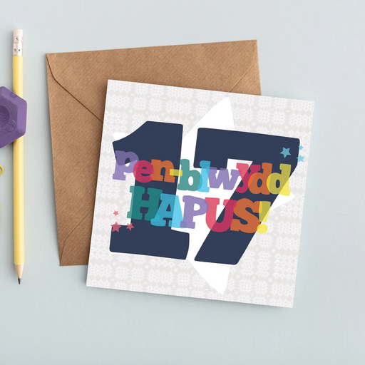 Description This colourful card is perfect to celebrate a special seventeenth birthday for a seventeen year old! 'Pen-blwydd hapus' is Welsh for 'H...