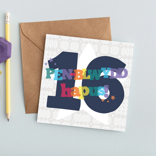 1 reviewDescription This colourful card is perfect to celebrate a special fifteenth birthday for a fifteen year old! 'Pen-blwydd hapus' is Welsh for 'Happy...