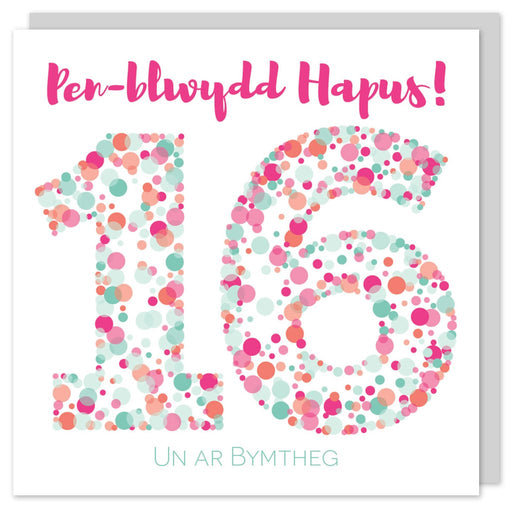 Description This bright card is perfect to celebrate a special sixteenth birthday! 'Pen-blwydd hapus' is Welsh for 'Happy birthday' and 'Un ar bymt...