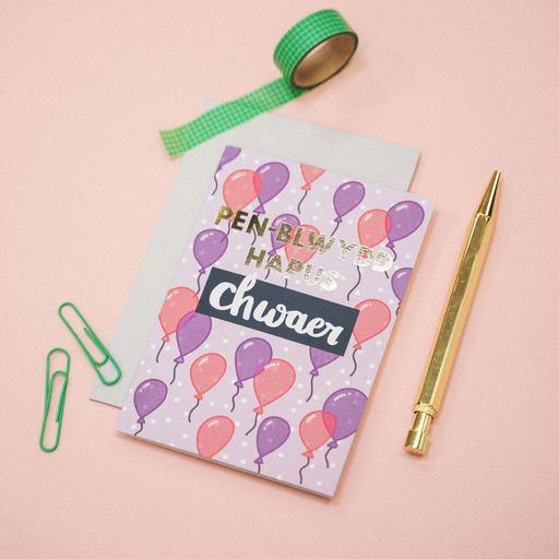 No reviewsDescription A bright and colourful Welsh birthday card featuring hand-written text and original illustrations, and is finished in gold foil. 'Pen-b...