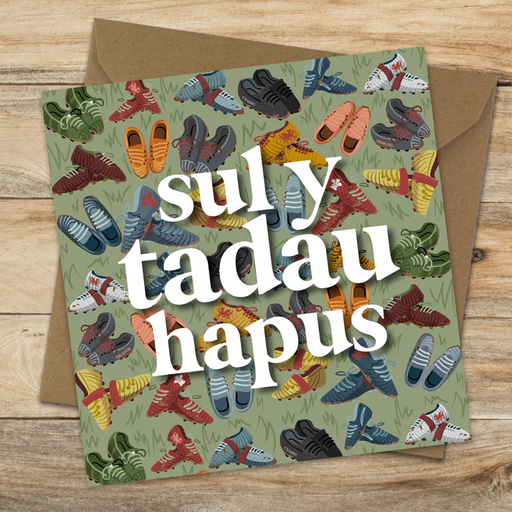 Description A stunning card with a beautiful lucky togs (football / rugby boots) background for a sports enthusiast. Sul y Tadau Hapus means 'Happy...