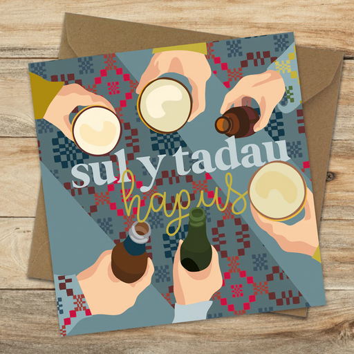 Description A stunning card with a beautiful blue background featuring a gorgeous tapestry pappern and everyone saying "cheers" to 'Sul y Tadau Hap...