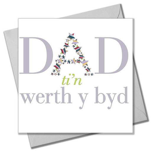 Description This modern card has 'Dad ti'n werth y byd' printed in large letters. The 'A' is 'Dad' is made of multi-coloured stars.  Details Square...