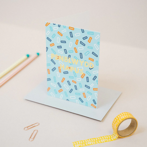 No reviewsDescription A bright and colourful Welsh birthday card featuring hand-written text and original illustrations, and is finished in gold foil. 'Penbl...