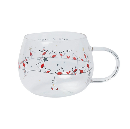 Description This beautiful glass mug featuring a festive robin design with metallic accents, as well as the Welsh for Merry Christmas - "Nadolig Ll...