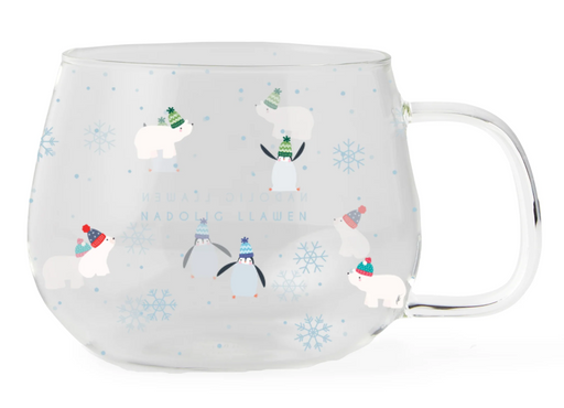 Description This beautiful glass mug featuring a festive penguin and polar bear design, as well as the Welsh for Merry Christmas - "Nadolig Llawen"...