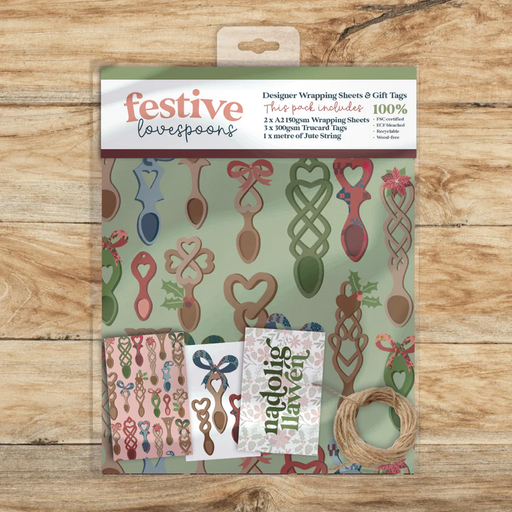 No reviewsDescription 2 sheets of recyclable wrapping paper, 3 matching gift and 1 metre of jute string in a compostable bag. This 'festive lovespoons' desig...