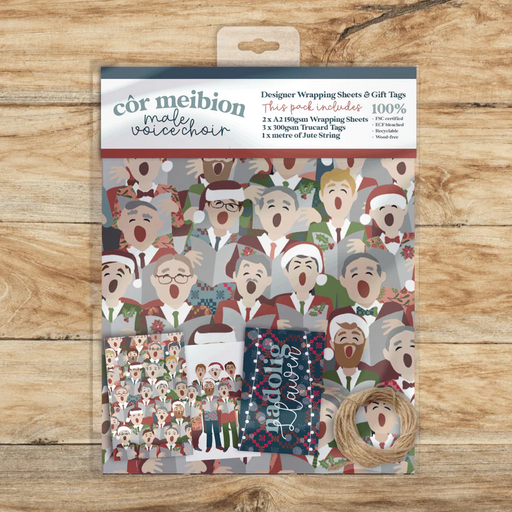 1 reviewDescription 2 sheets of recyclable wrapping paper, 3 matching gift and 1 metre of jute string in a compostable bag. This 'côr meibion' design, recy...