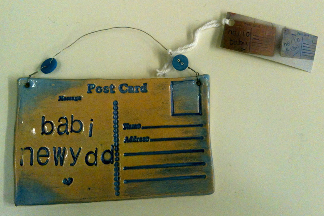 This is a funky ceramic postcard, with the words 'Babi Newydd' , which means New Baby in Welsh, imprinted into the clay.