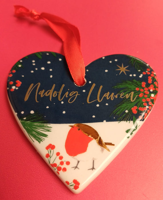 This beautiful ceramic heart-shaped decoration features a festive robin design in a snowy, starlit scene, with the Welsh words for Merry Christmas - "Nadolig Llawen".