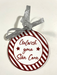 This beautiful ceramic bauble-shaped decoration features festive stripes, and the text 'Galwch yma Siôn Corn', which means 'Please stop here Santa' in Welsh.