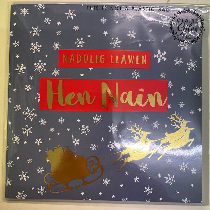 Christmas card 'Nadolig Llawen Hen Nain' great-grandma foil - snowflakes & sleigh